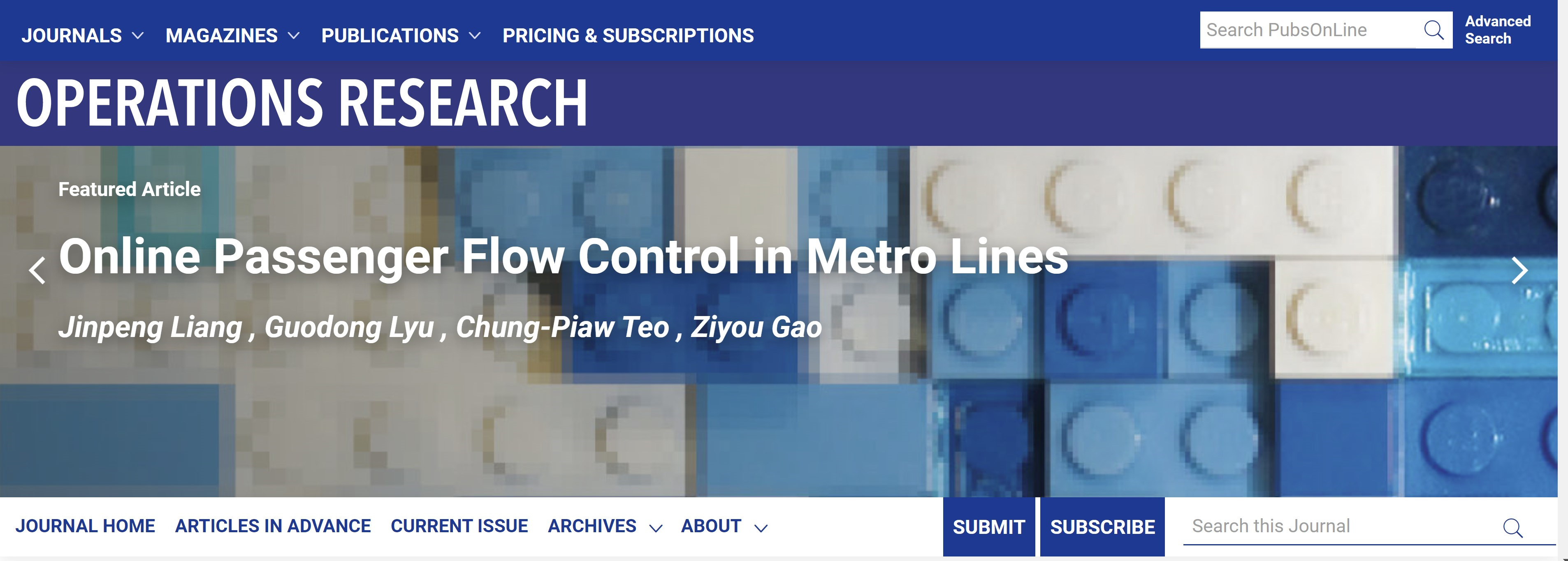 在国家自然科学基金基础科学中心项目和青年基金项目(批准号:72288101,72101042)资助下,番号鸽 高自友教授团队与新加坡国立大学张俊标教授团队合作,针对大城市轨道交通的高峰时段客流控制问题开展研究,设计了基于实时需求信息的客流控制策略。该成果以“城市轨道交通在线客流控制(Online Passenger Flow Control in Metro Lines)”为题,于2023年发表在《运筹学》(Operations Research)上,论文链接: //doi.org/10.1287/opre.2022.2417,并被选为当期的两篇亮点论文(Featured Article)之一(如图1所示)。